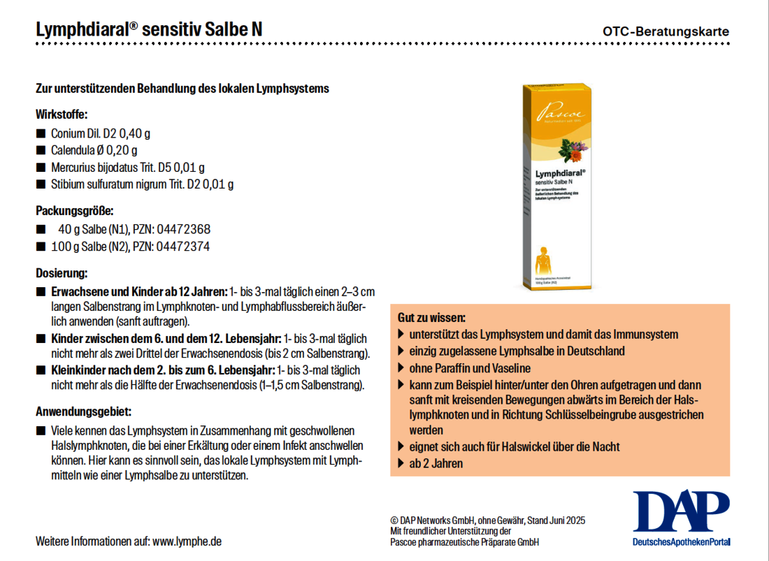 Das Lymphsystem ist vielen vor allem im Zusammenhang mit geschwollenen Halslymphknoten bekannt, wie sie typischerweise bei Infekten der oberen Atemwege auftreten. In solchen Fällen kann eine unterstützende Maßnahme zur Förderung der lokalen Lymphzirkulation mit der Lymphdiaral® sensitiv Salbe N sinnvoll sein. Folgende Beratungskarte gibt auf einen Blick eine Übersicht über alle wichtigen Punkte für die Beratung.