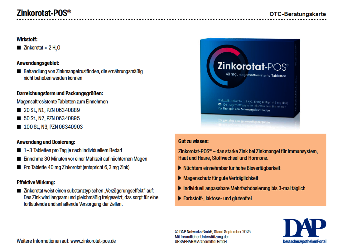 Zinkorotat-POS® wird zur Behandlung von Zinkmangelzuständen empfohlen, die ernährungsbedingt nicht behoben werden können. DAP hat auf dieser Beratungskarte alle wichtigen Informationen für die Beratung in der Apotheke zusammengefasst.