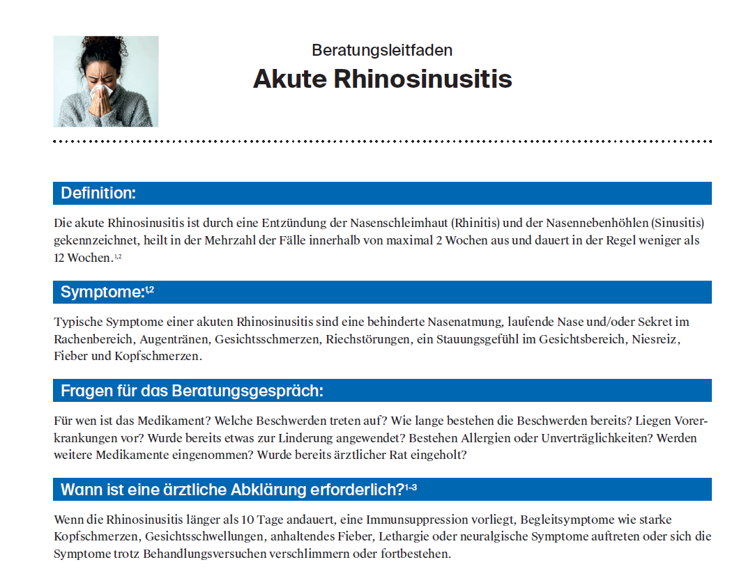 Die akute Rhinosinusitis ist eine Entzündung der Nasenschleimhaut und der Nasennebenhöhlen, durch die neben einer laufenden Nase auch Augentränen oder Kopfschmerzen auftreten können. Der folgende Beratungsleitfaden gibt einen Überblick über Symptome, medikamentöse und nicht-medikamentöse Therapien, unterstützende Maßnahmen sowie die Grenzen der Selbstmedikation.