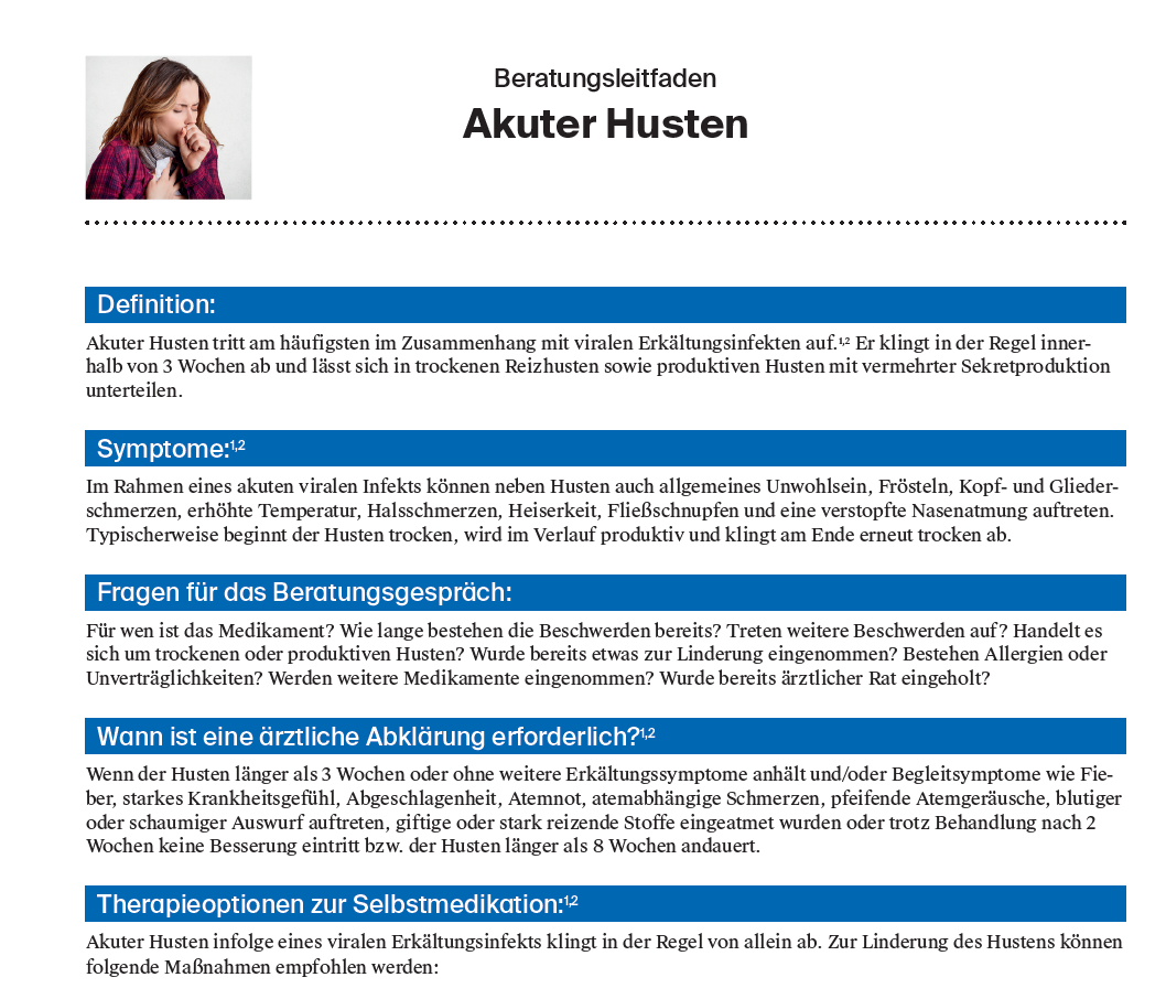 Akuter Husten tritt häufig im Zusammenhang mit Erkältungsinfekten auf und kann belastend sein. Welche Arten von akutem Husten es gibt, welche Maßnahmen Linderung verschaffen und allgemein die Genesung unterstützen und wann eine ärztliche Abklärung erforderlich ist, schildert der nachfolgende Beratungsleitfaden.