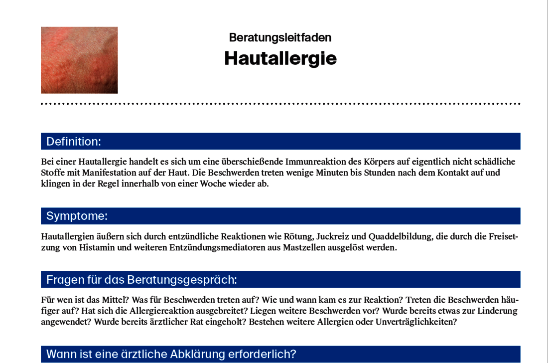 Eine Hautallergie ist eine vorübergehende Reaktion des Körpers auf eigentlich nicht schädliche Stoffe, die aufgrund von z. B. Juckreiz oder Quaddeln lästig sein kann. Der nachfolgende Beratungsleitfaden fasst zusammen, wie die Haut beruhigt werden kann und ab wann eine ärztliche Abklärung sinnvoll ist.