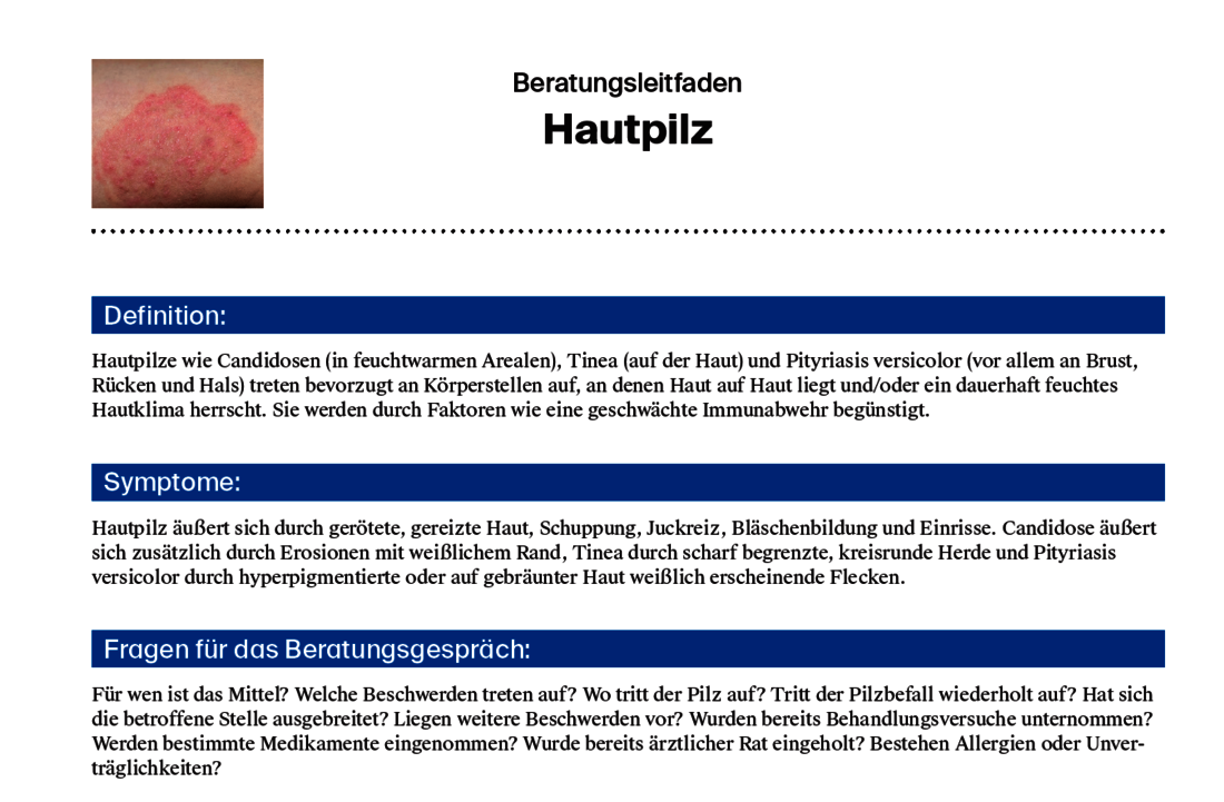 Hautpilz tritt bevorzugt an Körperstellen auf, an denen Haut auf Haut liegt und/oder ein feuchtes Klima herrscht. Welche Pilzart die Ursache von z. B. Schuppung und Juckreiz sein könnte, welche Antimykotika infrage kommen und ab wann eine ärztliche Abklärung sinnvoll ist, schildert der nachfolgende Beratungsleitfaden.