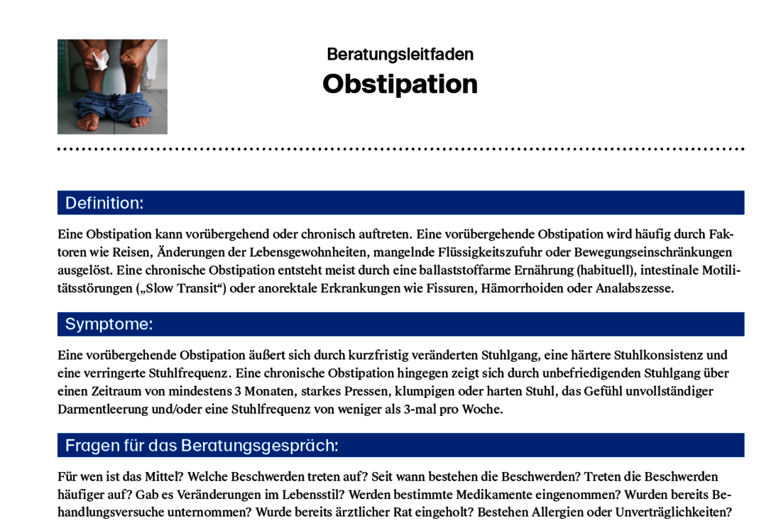 Eine Obstipation kann je nach Ursache vorübergehend (z. B. Reisen) oder chronisch (z. B. ballaststoffarme Ernährung) auftreten. Wie sich die Arten der Obstipation unterscheiden, welche Maßnahmen im Ernstfall helfen oder vorbeugend wirken können und was die Grenzen der Selbstmedikation sind, beschreibt der nachfolgende Beratungsleitfaden.