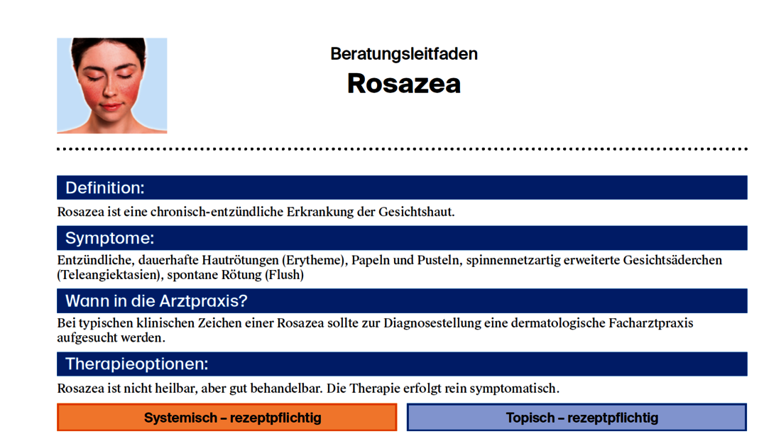 Rosazea ist eine chronisch-entzündliche Erkrankung der Haut, die mit dauerhaften Hautrötungen im Gesicht einhergeht. Heilbar ist Rosazea nicht, aber gut behandelbar. Der nachfolgende Beratungsleitfaden zeigt auf, was bei Rosazea zu beachten ist und welche Therapiemöglichkeiten es gibt.