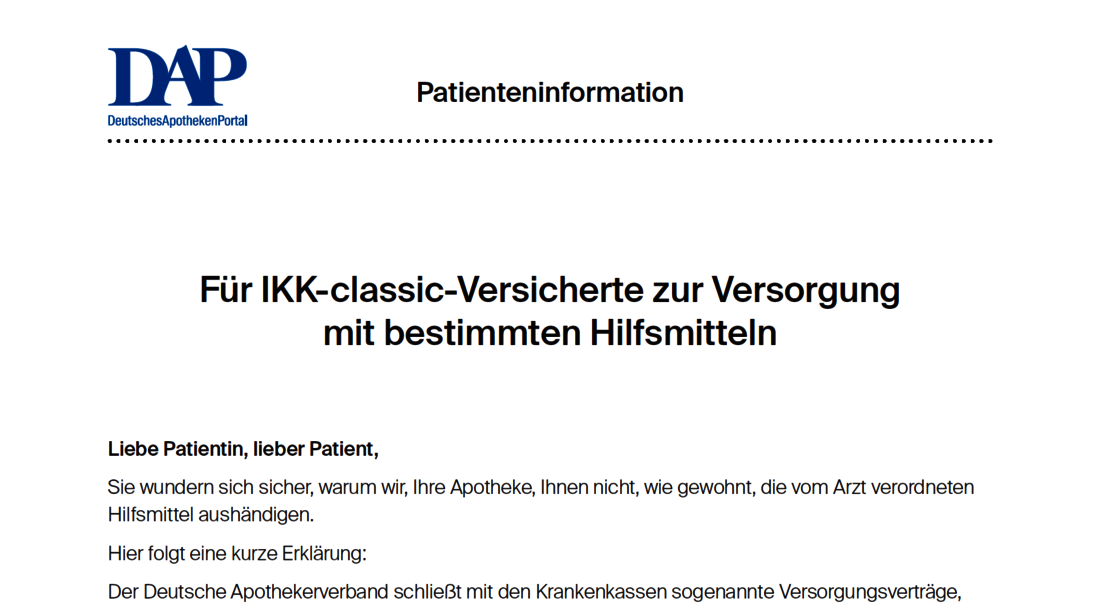 Die IKK classic hat den bestehenden Hilfsmittelversorgungsvertrag (nicht Pflegehilfsmittelvertrag) mit dem DAV zum 30.06.2025 gekündigt. Die IKK classic bestand, laut DAV, auf für die Apotheken wirtschaftlich nicht tragbaren Konditionen.