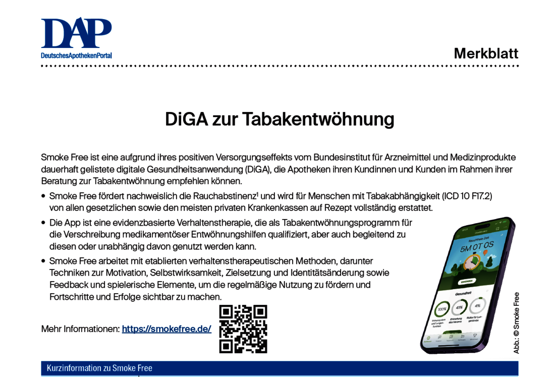 Smoke Free ist eine aufgrund ihres positiven Versorgungseffekts vom Bundesinstitut für Arzneimittel und Medizinprodukte dauerhaft gelistete digitale Gesundheitsanwendung (DiGA). Sie kann im Rahmen der Tabakentwöhnung als evidenzbasierte Verhaltenstherapie angewendet werden und fördert nachweislich die Rauchabstinenz. Das folgende Merkblatt gibt einen Überblick über die Anwendung in Kombination mit medikamentösen Entwöhnungshilfen, die verhaltenstherapeutischen Methoden, die Funktionsweise sowie die Freischaltung einer kostenlosen Version.
