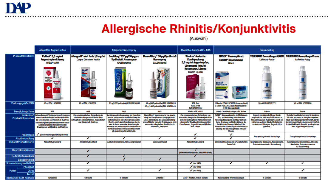 Zu den charakteristischen Symptomen einer allergischen Rhinitis zählen Niesen, Juckreiz, Obstruktion und Sekretion. Oft gehören Sinusitis und auch Konjunktivitis zu den Begleiterscheinungen. Je nach Schweregrad kann die Lebensqualität durch eine allergische Rhinitis bzw. Konjunktivitis enorm eingeschränkt sein. Das neue DAP Poster gibt eine Übersicht über Produktangaben wie Packungsgrößen, PZN und Darreichungsformen sowie hilfreiche Informationen zu Zusammensetzung, Anwendung und Herstellerinformationen.
