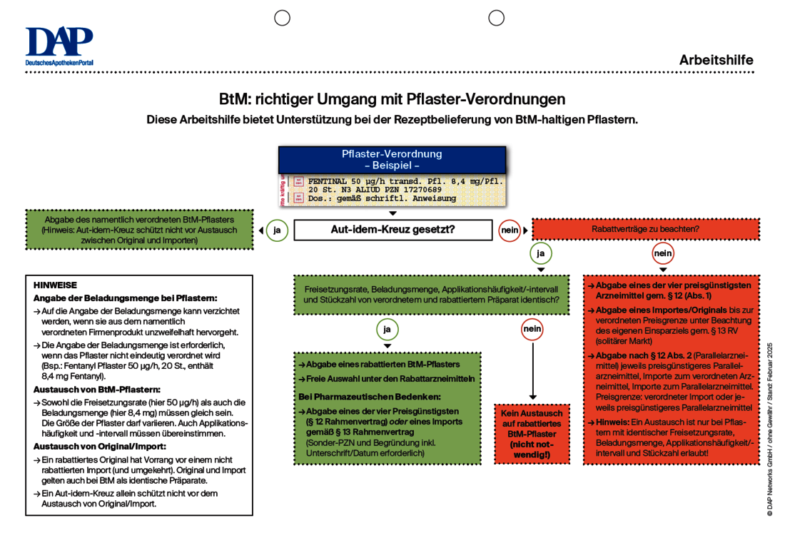 Auch bei Verordnungen von BtM-Pflastern müssen Rabattverträge beachtet werden. Bei der Rezeptbelieferung sind jedoch in Hinblick auf den Aut-idem-Austausch einige Besonderheiten, wie z. B. Beladungsmenge, Freisetzungsrate und Applikationshöchstdauer, zu beachten. Die Arbeitshilfe „BtM: Richtiger Umgang mit Pflaster-Verordnungen” bietet Unterstützung bei der Abgabe von BtM-Pflastern.
