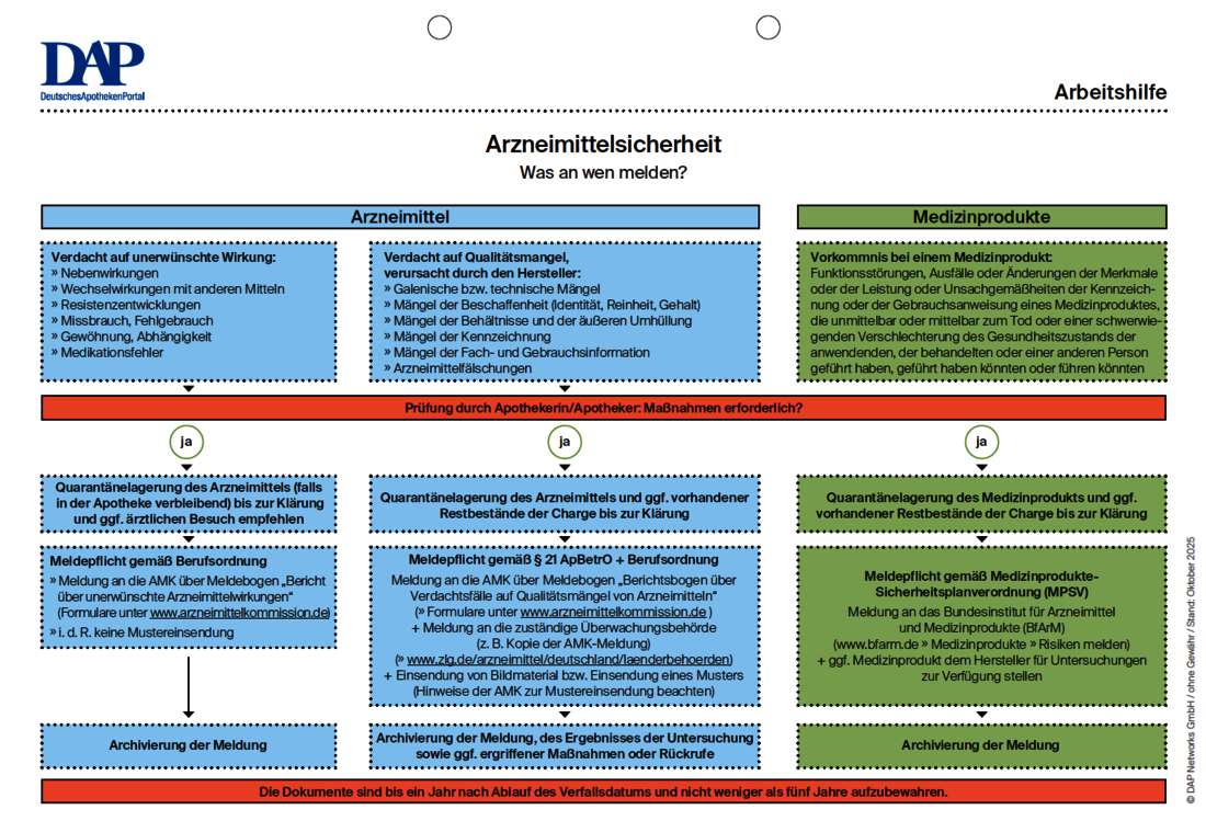 Die Angehörigen der Gesundheitsberufe sind dazu aufgerufen, jeden Verdacht auf Nebenwirkungen oder Qualitätsmängel bei Arzneimitteln und Medizinprodukten zu melden. Doch was muss an welche zuständigen Stellen gemeldet werden? Die DAP Retax-Arbeitshilfe zum Thema Arzneimittelsicherheit zeigt übersichtlich die Vorgehensweise und die zuständigen Stellen bei Feststellung von UAW und Qualitätsmängeln in der Apotheke.