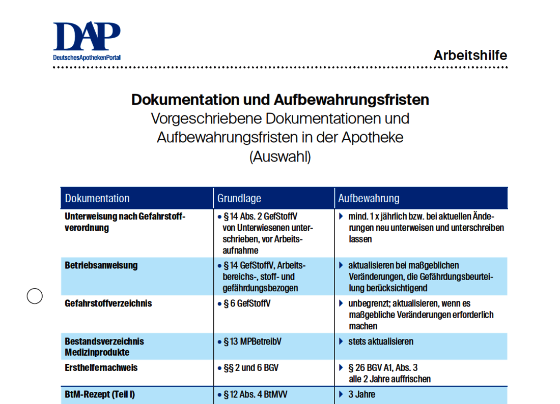Eine detaillierte Übersicht der Aufbewahrungsfristen ist auf der DAP Retax-Arbeitshilfe „Dokumentation und Aufbewahrungsfristen“ zu finden.