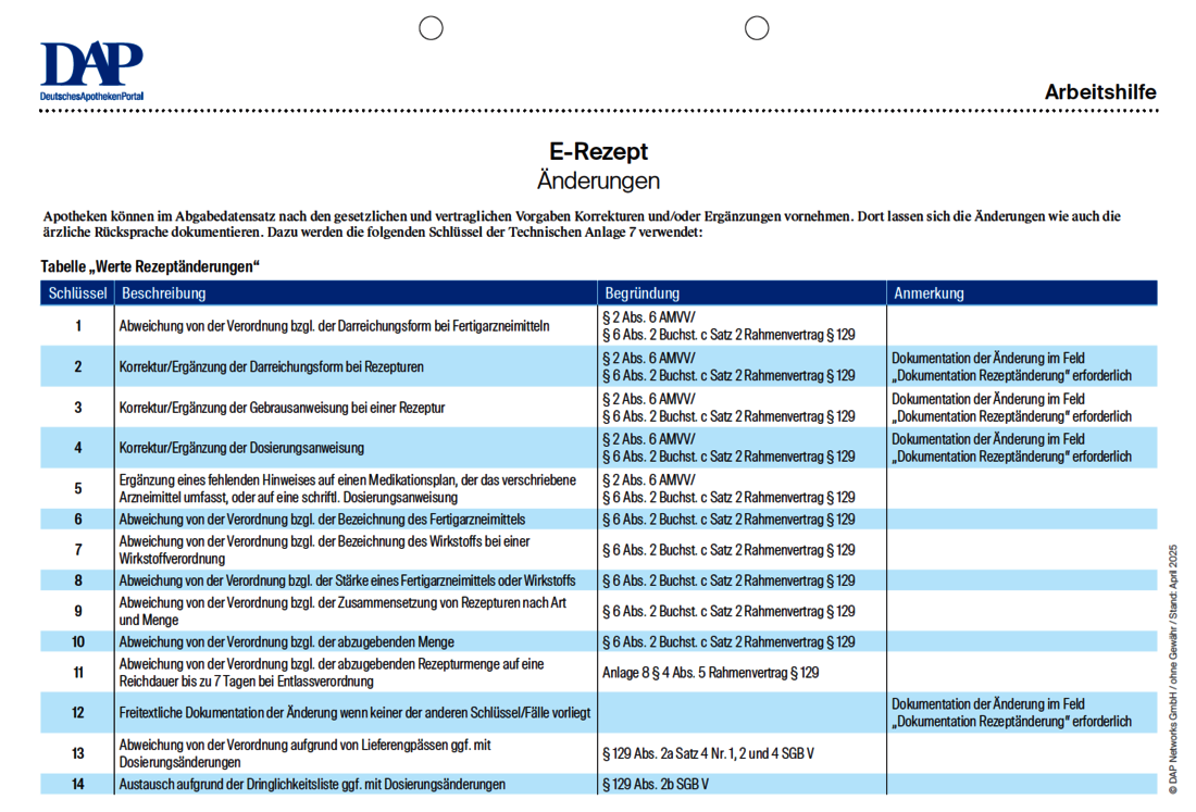 Apotheken können im Abgabedatensatz der E-Rezepte nach den gesetzlichen und vertraglichen Vorgaben Korrekturen und/oder Ergänzungen vornehmen. Dazu sind die Schlüssel der Technischen Anlage 7 zu verwenden. Diese Arbeitshilfe listet die Anwendungsbereiche der 12 Schlüssel auf.
