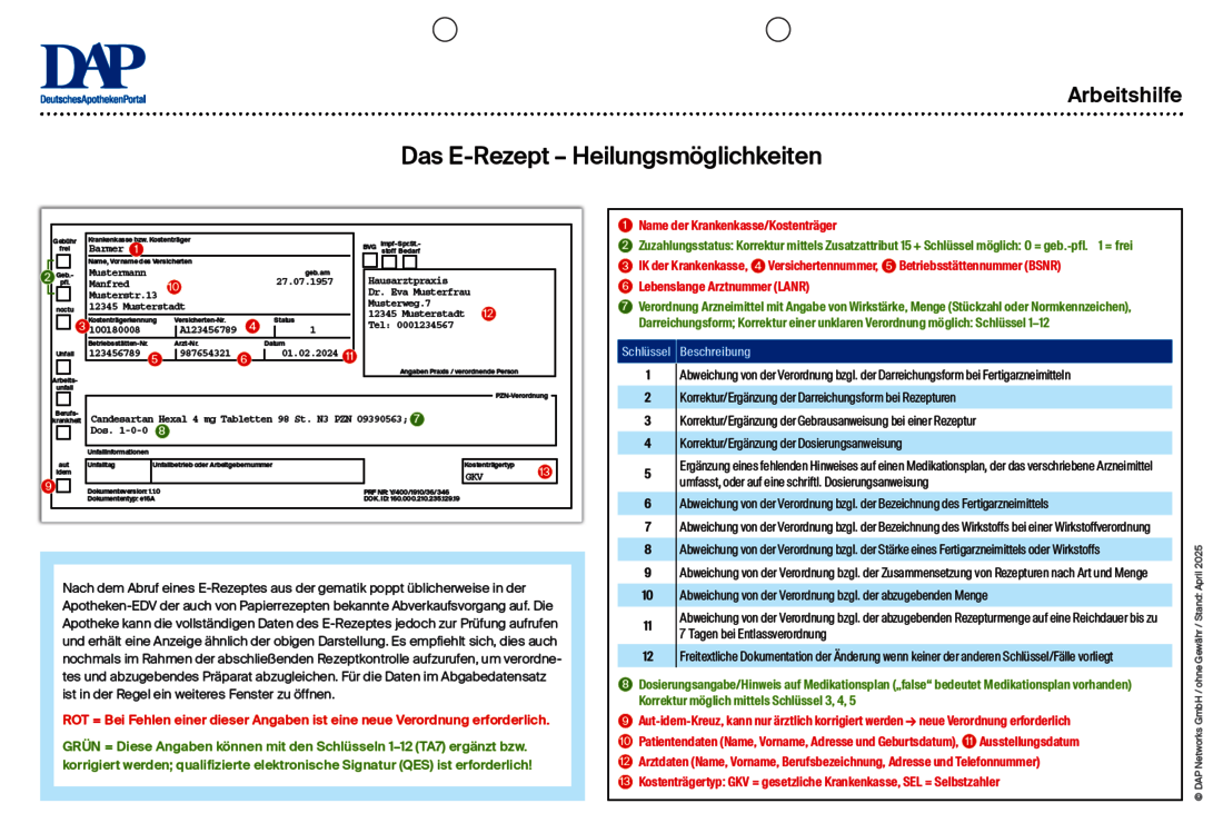 Auch beim E-Rezept treten immer wieder Formfehler auf. Die Heilungsmöglichkeiten unterscheiden sich jedoch etwas von den Möglichkeiten bei einem Muster-16-Rezept. Was Apotheken auf dem E-Rezept heilen dürfen und was nicht, regeln die Arzneimittelverschreibungsverordnung und der Rahmenvertrag. Die folgende Arbeitshilfe stellt dies bildlich dar: