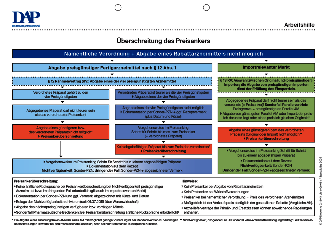 Mit der namentlichen Verordnung eines bestimmten Arzneimittels setzt der Arzt eine Preisgrenze (= Preisanker). Diese darf die Apotheke bei der Auswahl und Abgabe eines Arzneimittels gemäß Rahmenvertrag nicht überschreiten. Was zu beachten ist, wenn dennoch, zum Beispiel aufgrund von Lieferengpässen, ein teureres Präparat als das verordnete abgegeben werden muss, zeigt die folgende Arbeitshilfe.