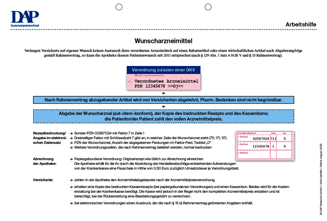 Verlangen Patienten auf eigenen Wunsch keinen Austausch ihres verordneten Arzneimittels auf einen Rabattartikel oder einen wirtschaftlichen Artikel nach Abgaberangfolge gemäß Rahmenvertrag, so kann die Apotheke diesem Patientenwunsch seit 2011 entsprechen (nach § 129 Abs. 1 Satz 6 SGB V und § 15 Rahmenvertrag). Wie die Apotheke vorgehen muss, um das Wunscharzneimittel abzurechnen, stellt die folgende Arbeitshilfe dar.