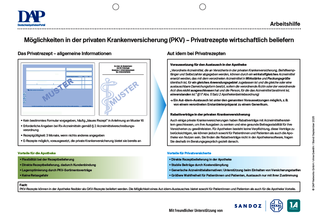 PKV-Rezepte können in der Apotheke oftmals flexibler als GKV-Rezepte beliefert werden. Welche Besonderheiten beim Privatrezept gelten und was Sie zum Beispiel bei einem Aut-idem-Austausch bei Privatrezepten beachten sollten, fasst diese Arbeitshilfe übersichtlich zusammen.