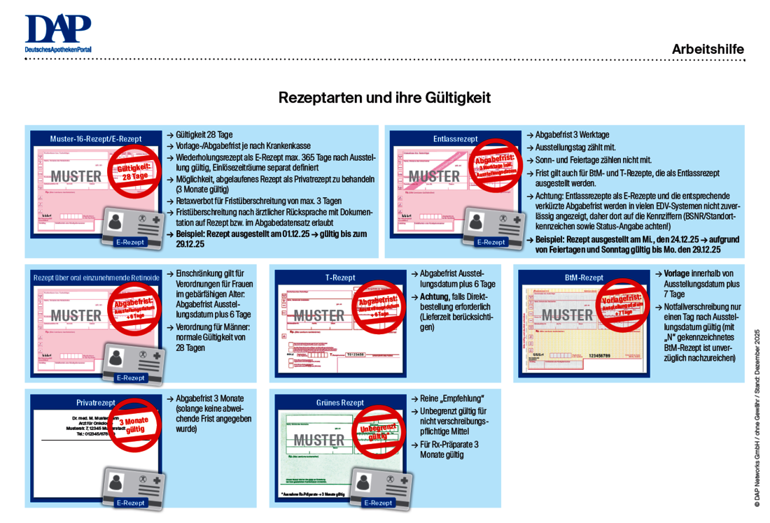 Rezepte, die in der Apotheke eingelöst werden, müssen innerhalb einer definierten Frist vorgelegt (im Falle von E-Rezepten abgerufen) und beliefert werden. Ist die Gültigkeit bereits abgelaufen, ist in der Regel ein neues Rezept erforderlich. Diese DAP Arbeitshilfe gibt Ihnen einen Überblick über die relevanten Fristen bei verschiedenen Rezepttypen.