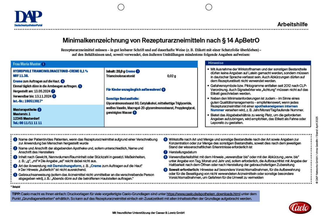 Rezepturarzneimittel werden in Apotheken nach hohen Qualitätsmaßstäben hergestellt. Dabei spielt auch das Etikett eine wichtige Rolle, welches die individuelle Kennzeichnung und damit eine sichere Anwendung über den gesamten Zeitraum der Haltbarkeit gewährleisten soll. Allerdings steckt der Teufel wie so oft im Detail – worauf bei der Kennzeichnung eines Rezepturarzneimittels geachtet werden muss, zeigt die folgende DAP Arbeitshilfe.