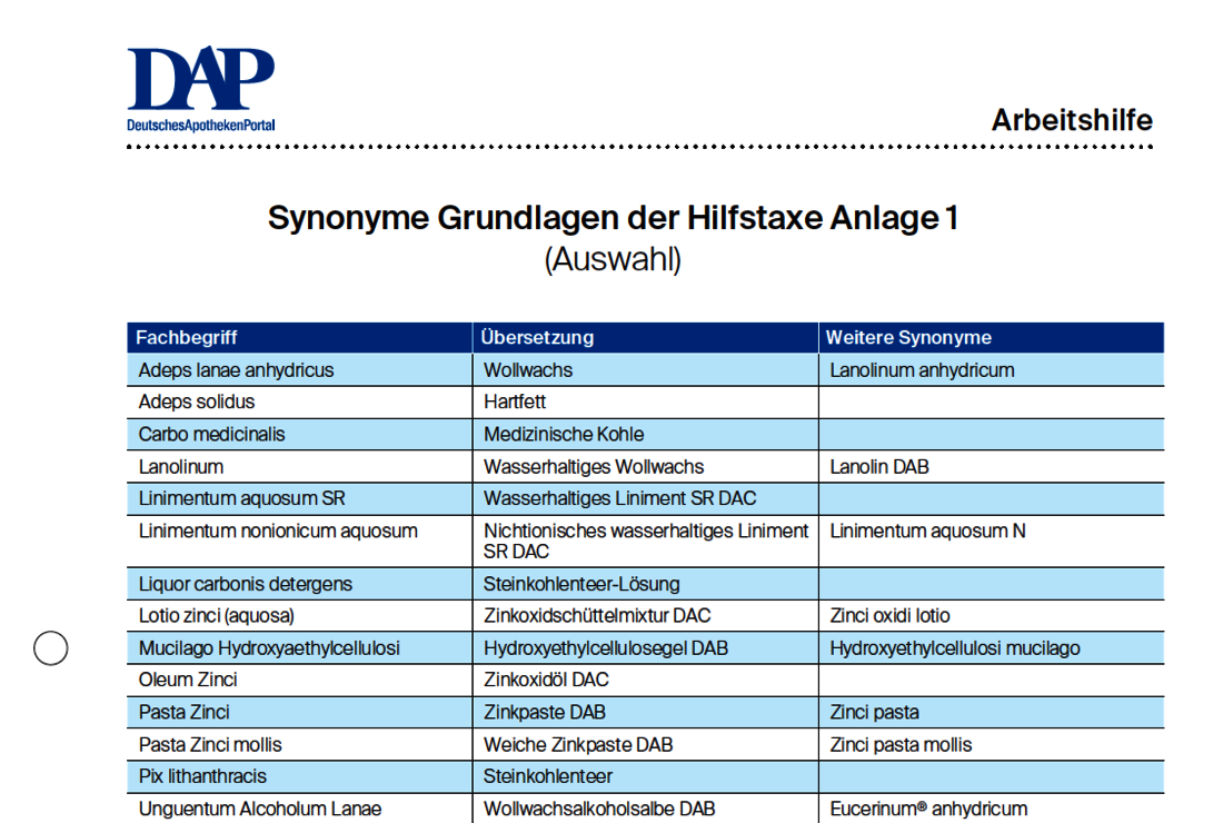 Es ist wohl fast jedem schon passiert: Man steht in der Rezeptur und einem fällt das Synonym einer Salbengrundlage nicht ein. Damit nun nicht mehr umständlich in der Literatur nachgeschlagen werden muss, sind auf der folgenden Arbeitshilfe die Synonyme der Grundlagen der Hilfstaxe Anlage 1 in einer praktischen Übersicht aufgeführt.