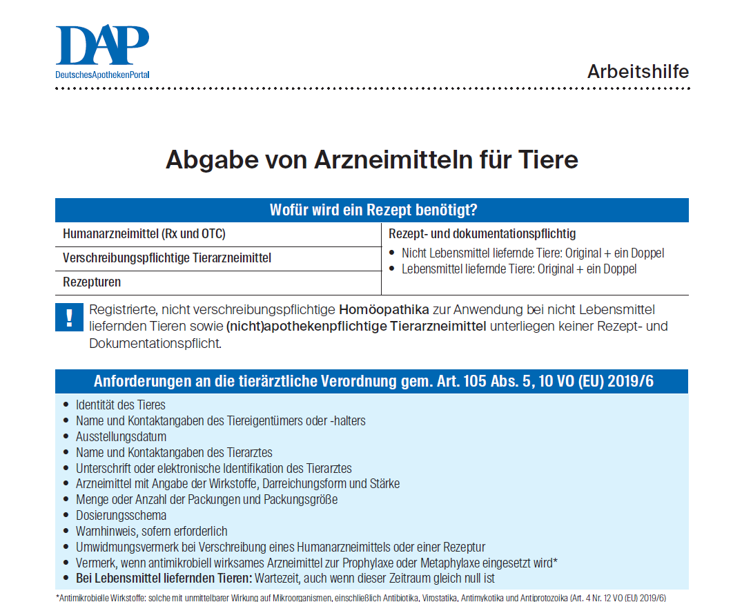 Seit dem 28. Januar 2022 gelten in Deutschland die EU-Tierarzneimittel-Verordnung (Verordnung (EU) 2019/6 über Tierarzneimittel) sowie das neu geschaffene Tierarzneimittelgesetz (TAMG). Die neuen EU-weiten Vorgaben zielen unter anderem darauf ab, den europäischen Binnenmarkt für Tierarzneimittel zu harmonisieren und die Verbreitung von Antibiotikaresistenzen einzudämmen. Auf dieser Arbeitshilfe finden Sie übersichtlich zusammengestellt, was unter Berücksichtigung des neuen Tierarzneimittelrechts bei der Belieferung von tierärztlichen Verordnungen durch Apotheken zu beachten ist.