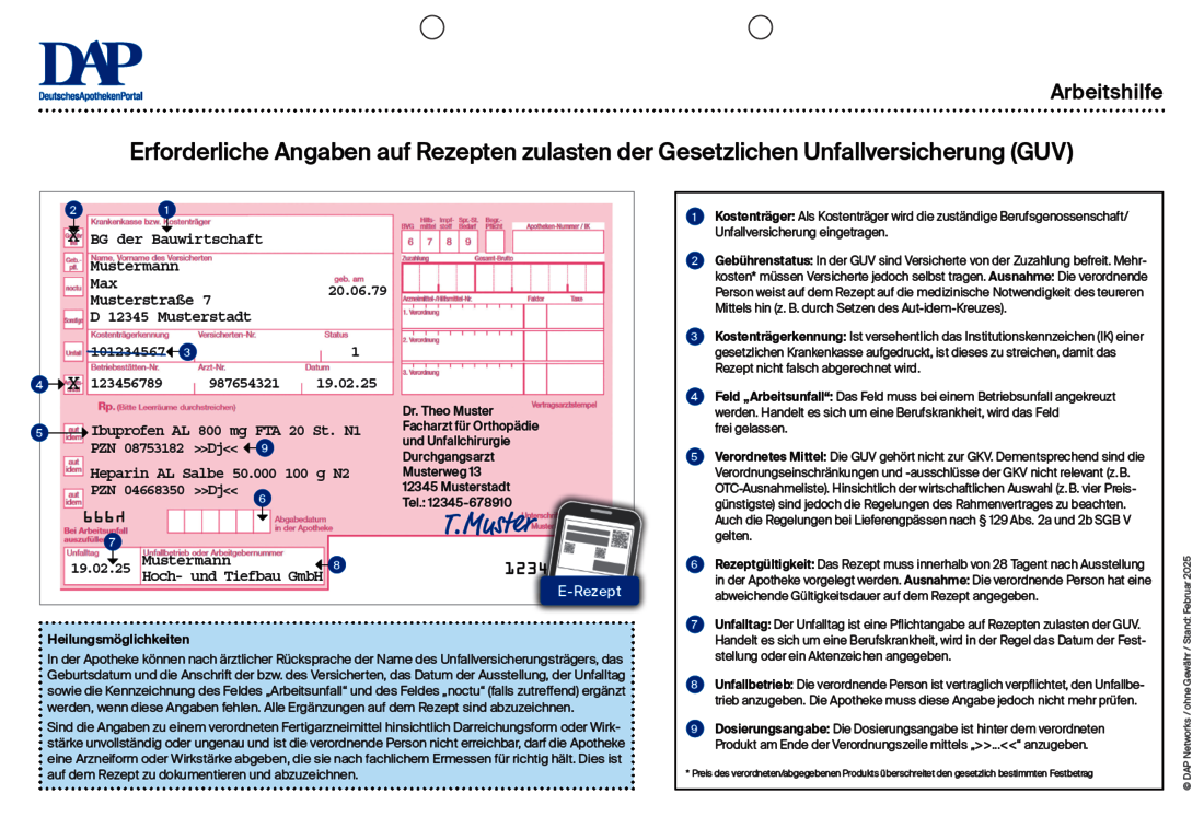 Bei Rezepten zulasten der Gesetzlichen Unfallversicherung (GUV) müssen Apotheken besondere Formalitäten prüfen und beachten. Die folgende Arbeitshilfe stellt übersichtlich dar, welche Angaben auf einem BG-Rezept gemacht werden müssen, damit die Verordnung ordnungsgemäß ausgestellt ist.