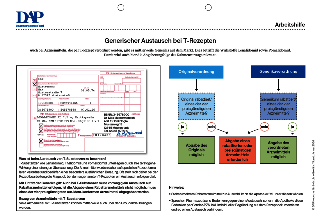 Seit dem Patentablauf von Lenalidomid (Revlimid) und Pomalidomid (Imnovid) müssen Apotheken bei entsprechenden T-Rezepten auch Generika berücksichtigen. Was dabei zu beachten ist und wie vorzugehen ist, erfahren Sie in der vorliegenden Arbeitshilfe
