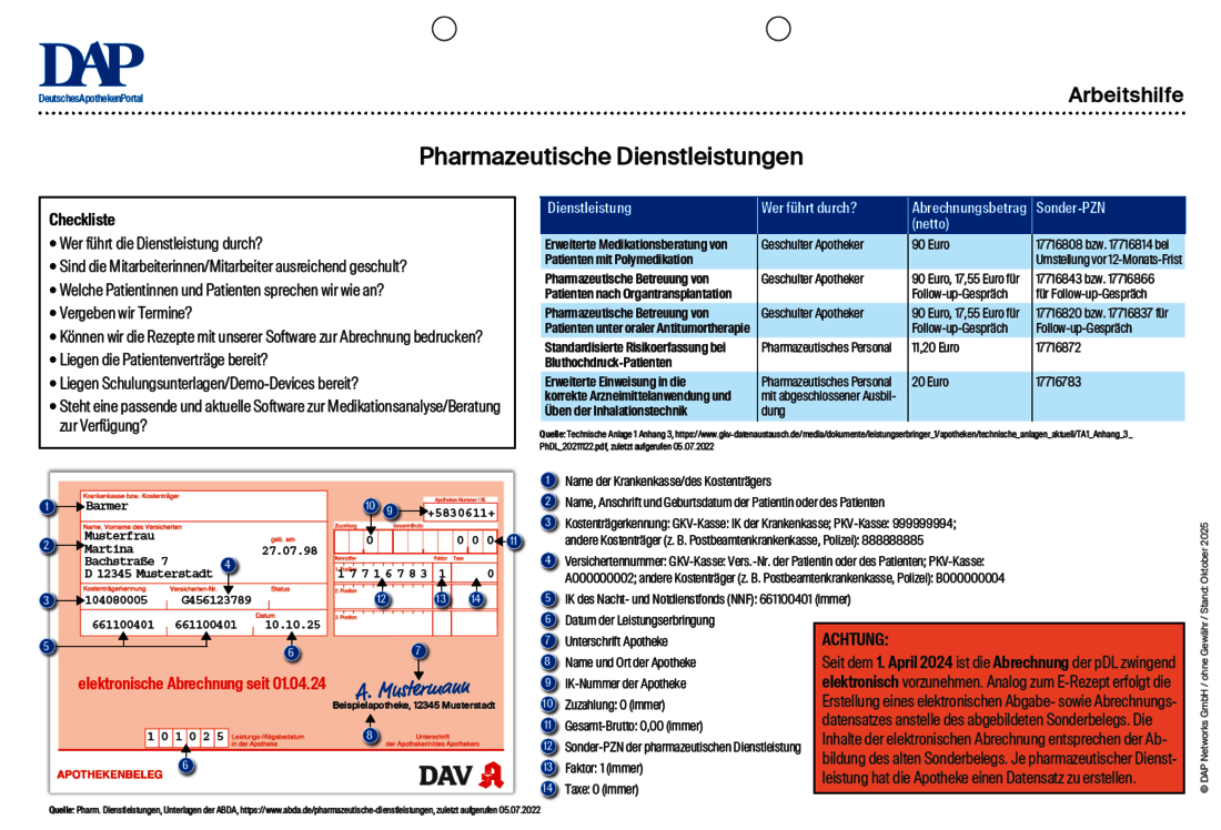 Pharmazeutische Dienstleistungen gehen über die Beratung gemäß § 20 der Apothekenbetriebsordnung hinaus und haben das Ziel, die Sicherheit und Wirksamkeit einer Arzneimitteltherapie zu verbessern. Wie Sie die fünf neuen pharmazeutischen Dienstleistungen abrechnen, zeigt die folgende Arbeitshilfe.