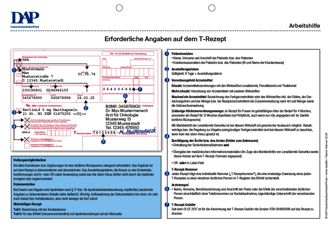 Auf dem T-Rezept werden die teratogenen Wirkstoffe Lenalidomid, Pomalidomid und Thalidomid verordnet. Bei Verordnung und Abgabe sind besondere Vorschriften zu beachten. So muss der Arzt beispielsweise auf dem Rezept bestätigen, dass alle Sicherheitsvorkehrungen eingehalten wurden. Eine praktische Hilfe bei der Belieferung von T-Rezepten ist die folgende Arbeitshilfe.