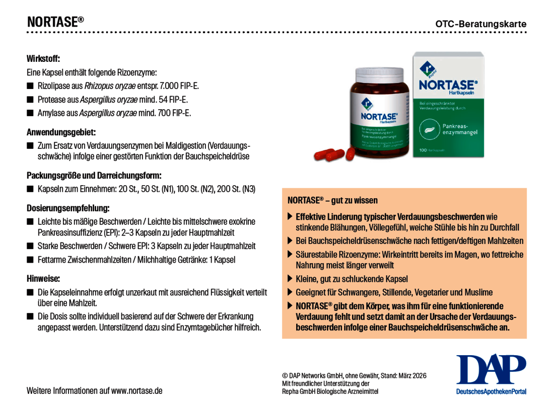 NORTASE® wird zum Ersatz von Verdauungsenzymen bei Maldigestion (Verdauungsschwäche) infolge einer gestörten Funktion der Bauchspeicheldrüse eingesetzt. Die Beratungskarte liefert alle wichtigen Informationen für die Beratung zu NORTASE® in der Apotheke.
