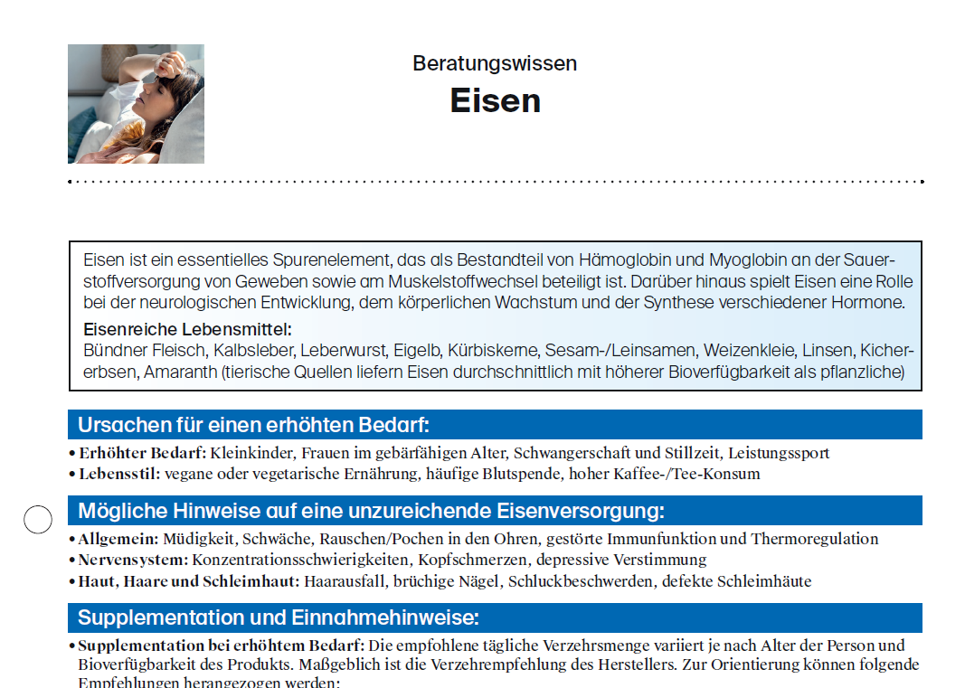 Eisen ist ein essentielles Spurenelement mit vielfältigen Funktionen im Körper. Das Beratungswissen bietet Ihnen einen kompakten Überblick zur Eisenversorgung und zu möglichen Ursachen für einen erhöhten Bedarf und unterstützt Sie bei der strukturierten Beratung zur Supplementation mit Eisenpräparaten.