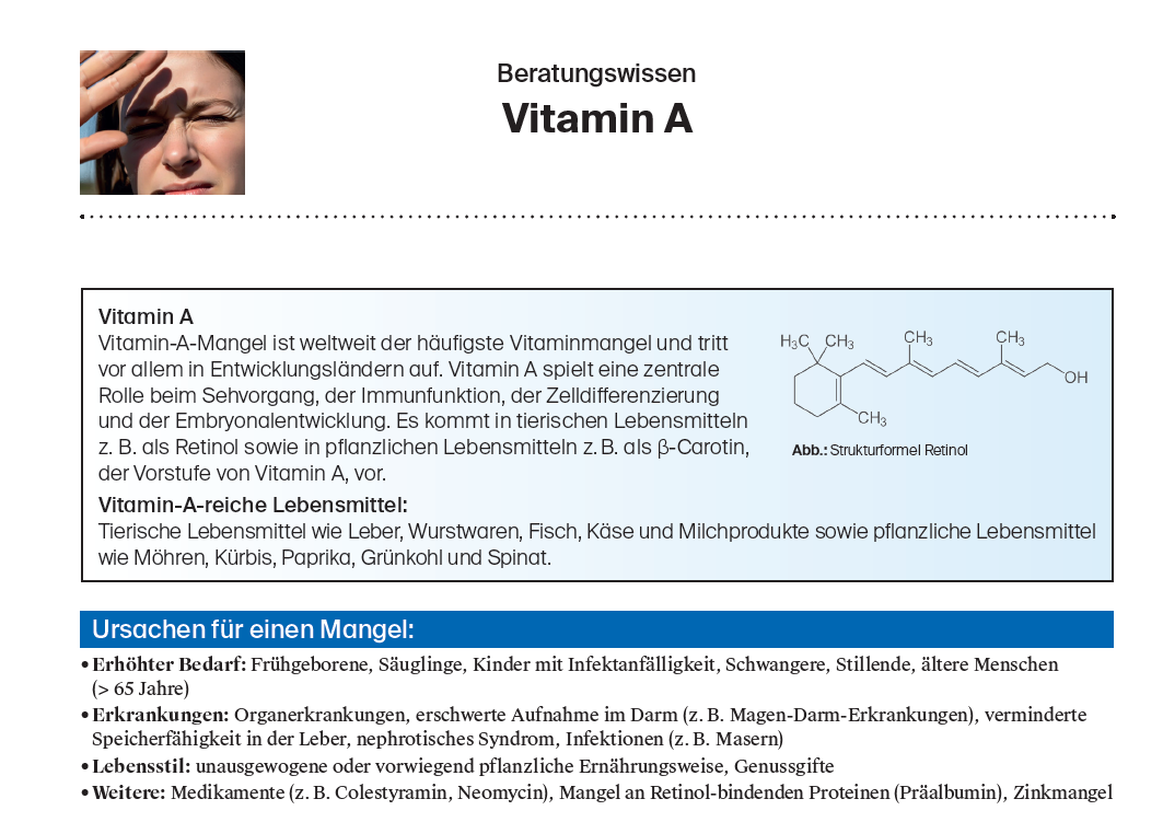 Vitamin A spielt u. a. eine zentrale Rolle beim Sehvorgang und bei der Immunfunktion und kommt in zwei verschiedenen Formen vor: als Retinol in tierischen Lebensmitteln und als β-Carotin in pflanzlichen Lebensmitteln. Ein Mangel kann durch einen erhöhten Bedarf, verschiedene Erkrankungen oder den Lebensstil entstehen und äußert sich durch Symptome, die u. a. die Augen, die Haut und das Immunsystem betreffen. Im folgenden Beratungswissen erfahren Sie mehr über die Rolle von Vitamin A, darüber, welche Ursachen ein Mangel haben kann und wie sich dieser äußert, wann und wie eine Therapie sinnvoll ist und mit welchen Arzneimitteln Vitamin A interagiert.