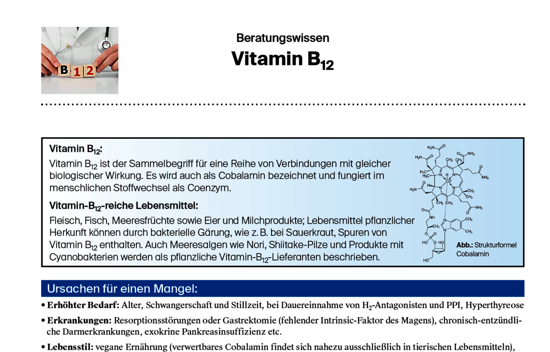 Vitamin B12 ist der Sammelbegriff für eine Reihe von Verbindungen mit gleicher biologischer Wirkung. Es wird auch als Cobalamin bezeichnet und fungiert im menschlichen Stoffwechsel als Coenzym. Ein Mangel kann durch bestimmte Erkrankungen oder lebensstilbedingte Faktoren entstehen und sich vielfältig äußern. Im folgenden Beratungswissen erfahren Sie, welche Ursachen und Symptome eines Vitamin-B12-Mangels relevant sind, welche Dosierungen sinnvoll sein können und welche Wechselwirkungen Sie im Beratungsgespräch berücksichtigen sollten.