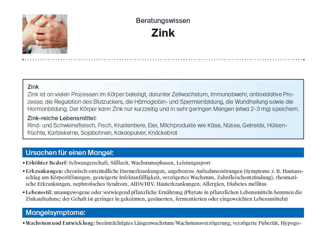 Zink ist an vielen Vorgängen wie der Immunabwehr, antioxidativen Prozessen und der Regulation des Blutzuckers beteiligt, wird jedoch nur in sehr geringen Mengen gespeichert. Ein Mangel kann durch einen erhöhten Bedarf, Erkrankungen oder den Lebensstil entstehen und Wachstum, Entwicklung, Haut, Immunfunktion sowie die Wundheilung beeinträchtigen. Im folgenden Beratungswissen erfahren Sie mehr über die Rolle von Zink, die Ursachen und Symptome eines Zinkmangels, die Therapie eines Mangels und darüber, wie Medikamente die Resorption oder Exkretion von Zink beeinflussen können.