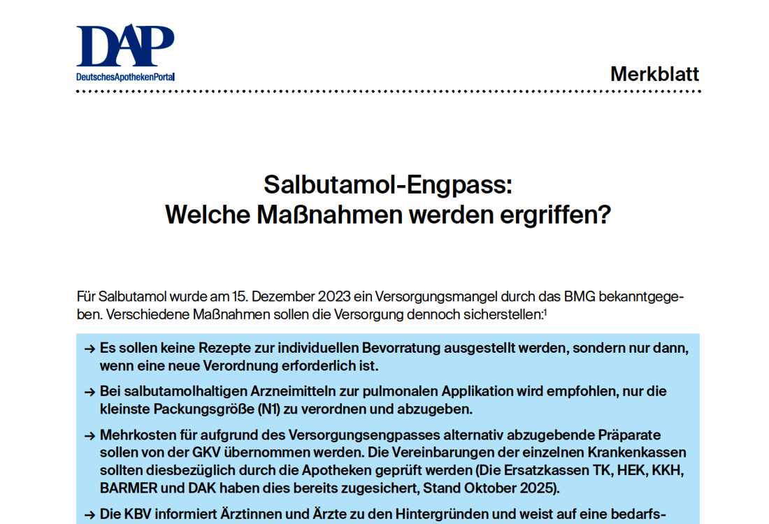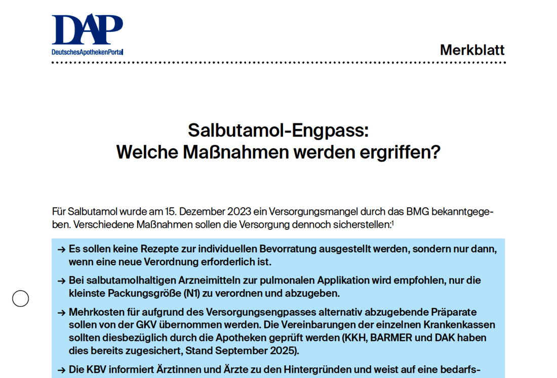 Bei Salbutamol-haltigen Arzneimitteln kommt es weiterhin regelmäßig zu Lieferengpässen. Um den Versorgungsengpass abzufedern, wurden verschiedene Maßnahmen ergriffen. Dieses Merkblatt gibt Ihnen eine Übersicht.