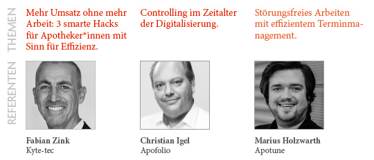 Alle zwei Monate geben drei interessante Persönlichkeiten ihren Input zu apotheken- und führungsrelevanten Themen. Jeder Redner hat für sein Thema 20 Minuten Zeit. Damit jeder ortsunabhängig davon profitieren kann, findet Apothekers Corner immer online statt. Sie brauchen nur ein Smartphone, ein Tablet oder einen Computer und schon sind Sie dabei. Nehmen Sie sich eine Stunde Zeit und holen Sie sich knackige Ideen in knapper Zeit.