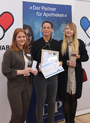 Abb.: Dr. Verena Kirsch (DAP) und Preisträgerinnen Friederike Schuster und Sabine Paulo aus der MediosApotheke (v. l.)