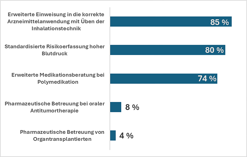 Die Mehrheit der Apotheken (85 %) bietet die pharmazeutische Dienstleistung „Erweiterte Einweisung in die korrekte Arzneimittelanwendung mit Üben der Inhalationstechnik“ an. Diese Dienstleistung kann von allen pharmazeutischen Fachkräften mit abgeschlossener Ausbildung durchgeführt werden. 80 % der Apotheken bieten zudem die pDL „Standardisierte Risikoerfassung hoher Blutdruck“ an, die auch von Pharmazeutinnen und Pharmazeuten im Praktikum (PhiP) und PTA im Praktikum durchgeführt werden darf. 74 % setzen die pDL „Erweiterte Medikationsberatung bei Polymedikation“ um, die nur von Approbierten mit zusätzlicher Qualifikation angeboten werden darf. Weniger verbreitet sind die pDL „Pharmazeutische Betreuung bei oraler Antitumortherapie“ (8 %) und „Pharmazeutische Betreuung von Organtransplantierten“ (4 %).