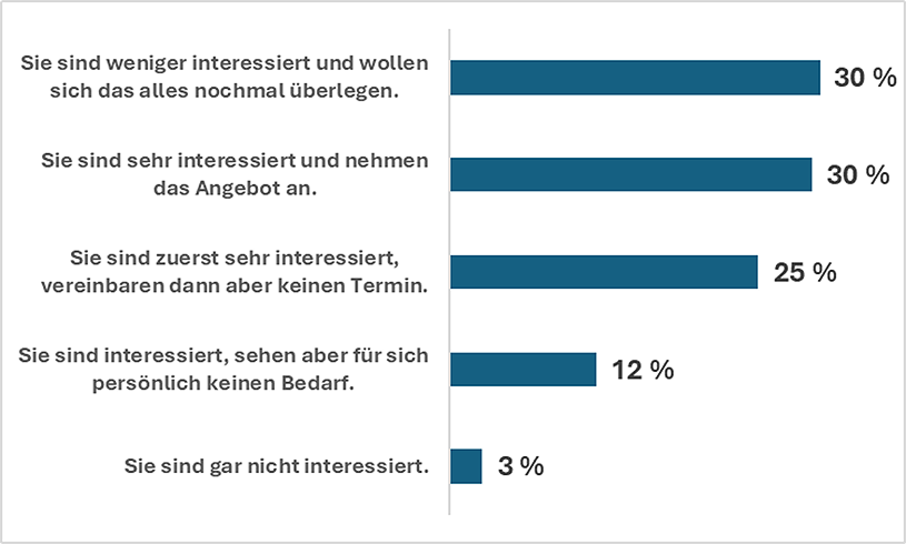 Die Reaktionen der Kundinnen und Kunden auf das neue Angebot sind noch uneinheitlich. 30 % der Befragten berichten von einem geringen Interesse, während ebenfalls 30 % angeben, dass ihre Kundschaft sehr interessiert ist und die Angebote auch annimmt. 25 % schildern, dass zunächst Interesse besteht, jedoch kein Termin vereinbart wird. 12 % sehen persönlich keinen Bedarf für pDL, und 3 % berichten von keiner Nachfrage seitens der Kundschaft.