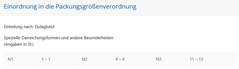 Da in der Packungsgrößenverordnung für Dulaglutid eine N1-Packungsgröße definiert, aber nicht im Handel ist, darf keine Packung auf Entlassrezept abgegeben werden.