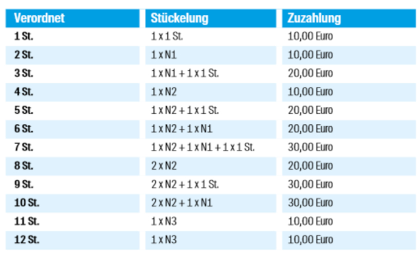 In Ihrem Fall wäre es wie folgt: 2 x 12 St. (N3) + 1 x 4 St. (N2) + 1 x 2 St. (N1) = 4 x Zuzahlung à 10 Euro.