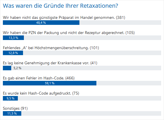 Von den Apotheken, die Cannabis-Rezepte beliefern, gaben 53,7 % an, schon mal eine Retaxierung bei einem Cannabis-Rezept bekommen zu haben. Die häufigsten Gründe waren dabei ein Fehler im Hash-Code (466) und dass nicht das günstigste im Handel befindliche Präparat für die Abgabe ausgewählt wurde (381). Aber auch ein fehlendes „A“ bei Höchstmengenüberschreitung (101) oder eine Abrechnung der PZN und nicht der Rezeptur (105) haben schon zu Retaxierungen geführt. Es gab bei der Umfrage auch die Möglichkeit, unter Sonstiges eine Freitextangabe zu machen. Hier wurde vor allem genannt, dass auch Taxierungsfehler und die Abrechnung des Herstellersets oder des Identifikationskits retaxiert wurden.