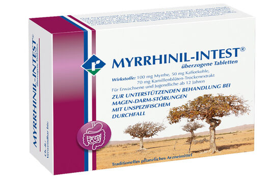 Anwendungsgebiete: Traditionelles pflanzliches Arzneimittel zur unterstützenden Behandlung bei Magen-Darm-Störungen mit unspezifischem Durchfall, begleitet von leichten Krämpfen und Blähungen ausschließlich aufgrund langjähriger Anwendung. Zusammensetzung: 1 überzogene Tablette enthält: 100 mg Myrrhe, 50 mg Kaffeekohle, 70 mg Trockenextrakt aus Kamillenblüten (4-6:1); Auszugsmittel: Ethanol 60 % (m/m). Sonstige Bestandteile: Gelbes Wachs, Calciumcarbonat, Carnaubawachs, Cellulosepulver, Eisenoxide und -hydroxide E 172, Eisen(III)-oxid E 172, sprühgetrockneter Glucose-Sirup, Kakaobutter, Macrogol 6000, Povidon K-90, Schellack (gebleicht, wachsfrei), hochdisperses Siliciumdioxid, Stearinsäure (Ph.Eur.) [pflanzlich], Sucrose, Talkum, Titandioxid E 171. Enthält Glucose und Sucrose (Zucker). Gegenanzeigen: Überempfindlichkeit gegen Kamille, andere Korbblütler, Myrrhe, Kaffeekohle oder einen der sonstigen Bestandteile. Kinder unter 6 Jahren. Nebenwirkungen: Häufigkeit nicht bekannt: Überempfindlichkeitsreaktionen insbesondere bei Allergikern. Pharmazeutischer Unternehmer: Repha GmbH Biologische Arzneimittel, Alt-Godshorn 87, 30855 Langenhagen.