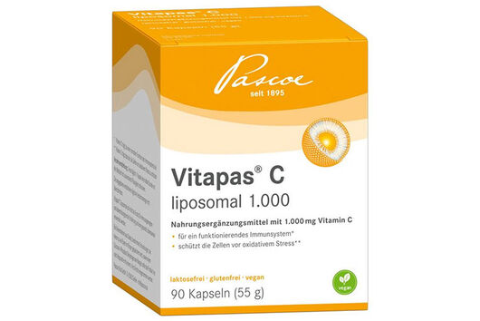 Mit Vitapas® C liposomal 1.000 steht ein Nahrungsergänzungsmittel zur Verfügung, das vegan sowie laktose-, fruktose- und glutenfrei ist. Es kommt ohne Konservierungsmittel und künstliche Farbstoffe aus und ist lange haltbar. Vitapas® C liposomal 1.000 wird in Deutschland mit Vitamin C aus Großbritannien hergestellt.