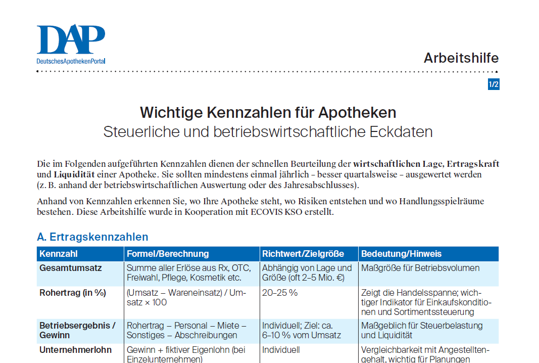 Die folgende Checkliste fasst zentrale Kennzahlen kompakt zusammen. Sie unterstützt dabei, die wirtschaftliche Situation der eigenen Apotheke systematisch zu analysieren und fundierte unternehmerische Entscheidungen zu treffen.