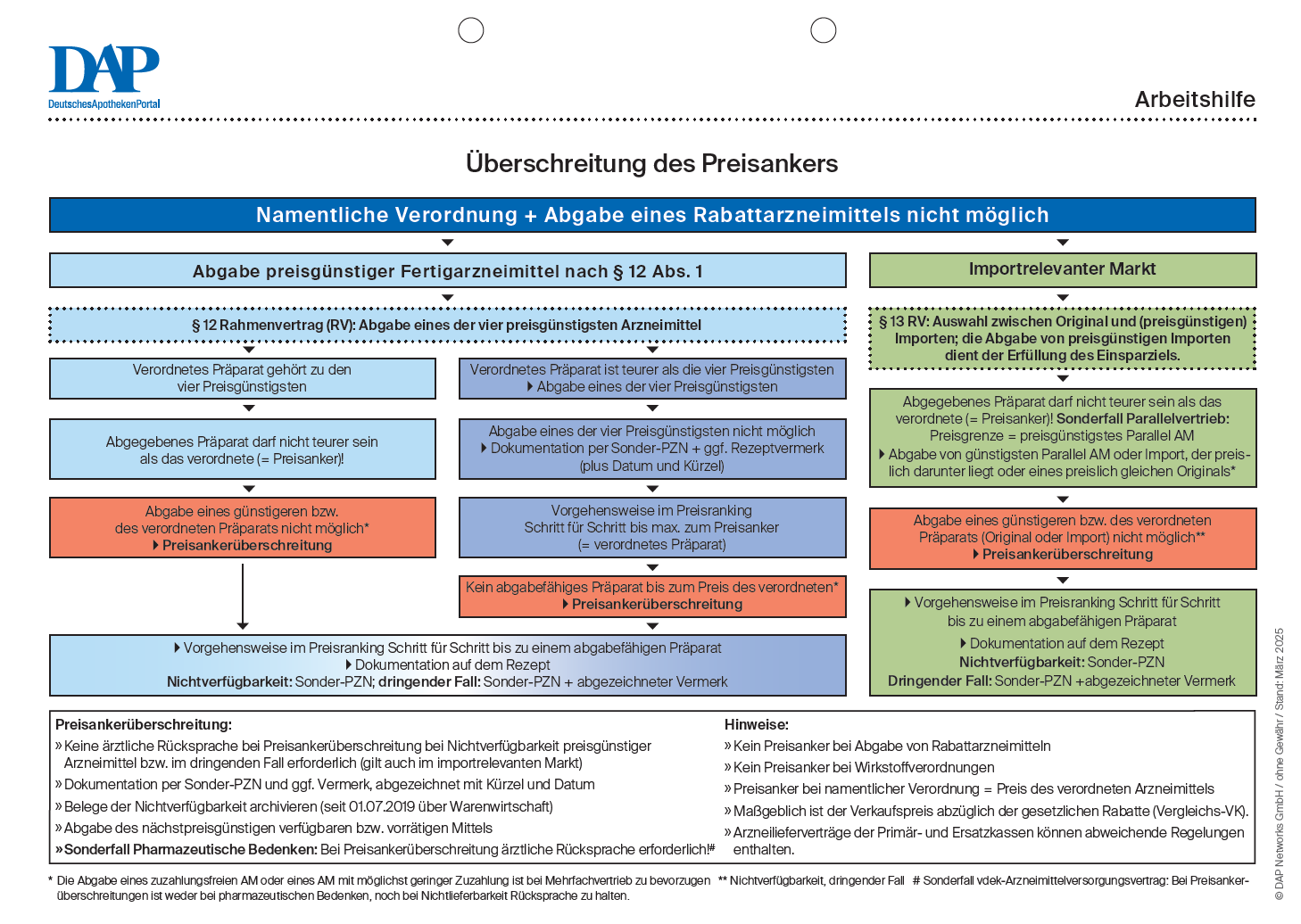 Mit der namentlichen Verordnung eines bestimmten Arzneimittels setzt der Arzt eine Preisgrenze (= Preisanker). Diese darf die Apotheke bei der Auswahl und Abgabe eines Arzneimittels gemäß Rahmenvertrag nicht überschreiten. Was zu beachten ist, wenn dennoch, zum Beispiel aufgrund von Lieferengpässen, ein teureres Präparat als das verordnete abgegeben werden muss, zeigt die folgende Arbeitshilfe.