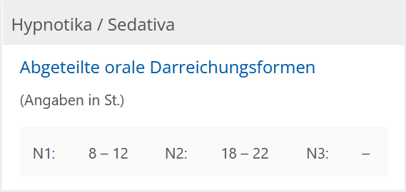 Nun ist es nicht immer leicht, OTC-Arzneimittel gemäß Packungsgrößenverordnung zu klassifizieren. Lasea wird nach unserer Einschätzung in den Bereich Hypnotika/Sedativa eingeordnet, für den folgende N-Bereiche gelten: