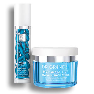 Das Set für den intensiven Feuchtigkeits-Kick beinhaltet die aufpolsternde Hyaluron Refill Cream und die reichhaltigen Hyaluron Filler Caps. Die 24-h Feuchtigkeitscreme für die trockene Haut zieht schnell ein, hinterlässt ein weiches, geschmeidiges Hautgefühl und füllt Trockenheitsfältchen auf. Die Feuchtigkeits-Kapseln verleihen ein samtiges, weiches Hautgefühl und polstern Trockenheitsfältchen gezielt auf. Das Hydro Active Duo hat einen Wert von je 88,00 Euro. Infos unter www.grandel.de