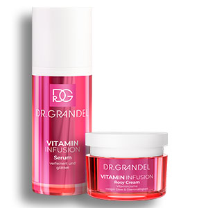 Das Duo vitamingeladener Beauty-Infusionen mit fruchtigen Extrakten aus der Granatapfelblüte und Mango schützt die Haut vor vorzeitiger Hautalterung. Die Vitamin Infusion Rosy Cream bringt die Haut sofort zum Strahlen und reduziert Fältchen durch Vitamin C. Das leichte Vitamin-Serum zieht schnell ein und sorgt für ein erfrischtes Hautgefühl. Das Vitamin Infusion Set hat einen Wert von 108,00 Euro. Infos unter www.grandel.de