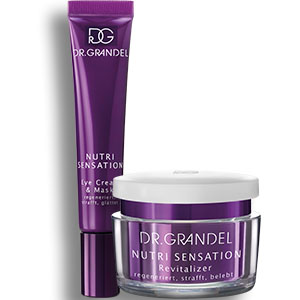 Das Pflegeset besteht aus dem hoch regenerativen Revitalizer und der Augenpflege Eye & Cream Mask mit Rotalgen-Extrakt. Während die 24-Stunden-Pflegecreme die anspruchsvolle Haut mit Vitamin E und Omega-Fettsäuren aus Himbeersamenöl versorgt, spendet die Augenpflege langanhaltend Feuchtigkeit und reduziert Schwellungen. Das Nutri Sensation Set hat einen Wert von je 102,00 Euro. Infos unter www.grandel.de