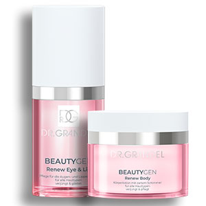Die Serie Beautygen mit Schneealgen Extrakt aktiviert das 'Schönheitsgen' der Haut und sorgt so für bessere Elastizität. Renew Eye & Lip pflegt die zarte Haut rund um die Augen und um die Lippenpartie. Die Körperlotion Renew Body hat einen zarten Schimmer und zieht dank ihrer leichten Textur schnell ein. Das Beautygen Set hat einen Wert von 99,00 Euro. Infos unter www.grandel.de
