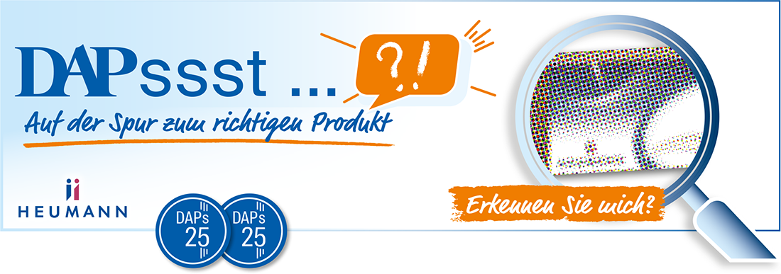 Bei DAPssst … Auf der Spur zum richtigen Produkt laden wir Sie ein, genauer hinzuschauen, mitzudenken und Ihre breiten Sortimentskenntnisse einzusetzen. In der Ich-Perspektive gibt das gesuchte Produkt Ihnen Hinweise zu Eigenschaften oder Einsatzgebiet. Lesen Sie die Hinweise aufmerksam, kombinieren Sie die Informationen – und finden Sie heraus, welches Produkt sich hier verbirgt. Denn wer dem Rätsel auf die Spur kommt, wird belohnt: Mit dem richtigen Lösungswort erhalten Sie 50 DAPs-Punkte, die Ihrem Nutzerkonto gutgeschrieben werden. Zum Sammeln von DAPs-Punkten ist eine kostenlose Registrierung bei Mein DAP erforderlich.